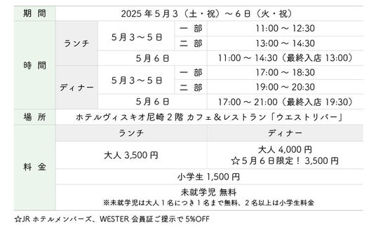 尼崎ホテル開発株式会社(兵庫県尼崎市、代表取締役社長 大矢 悦子)が運営するホテルヴィスキオ尼崎は、カフェ&レストラン「ウエストリバー」において、2025年5月3日(土・祝)から2025年5月6日(火・祝)の期間、ランチとディナーの時間帯で「ゴールデンウィークファミリーバイキング」を開催いたします。シェフ自慢の洋食を中心に、お子様から大人までご家族で楽しめる料理の品々がバイキング形式で90分間食べ放題です。