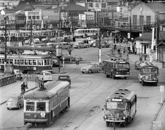 1958年 桜木町駅前の弁天橋を渡る横浜市電やバス