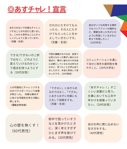 「あすチャレ!」の参加者の皆さんからたくさん聞く言葉が『目から鱗でした』です。これまで意識していなかった視点に気づき、視点が変わることで「できない」と思っていたことも「できる」に変えられる、DE&I社会に向けて『明日へのチャレンジ』をしていただける全国の58万人の『仲間』と出会うことができました。