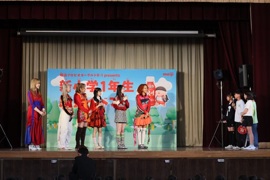入学式シーズンに小学生と保護者を応援するために、東京都足立区立中川北小学校にて「明治プロビオヨーグルトR-1 presents 新小学1年生応援イベント」を4月9日(水)に実施いたしました。当日は在校生約420人が参加し、サプライズゲストとして、Little Glee Monsterに登場、新応援ソング「Run」や代表曲「世界はあなたに笑いかけている」を披露しました。