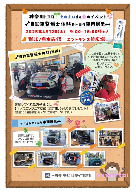 2025年4月12日(土)に、新江ノ島水族館で春のイベントを実施いたします。当イベントでは、大変ご好評いただいております【自動車整備士体験】や【給電のできる電動車をはじめとするファミリー向けの車両】いざという時におすすめの【防災・給電グッズ】を展示します!