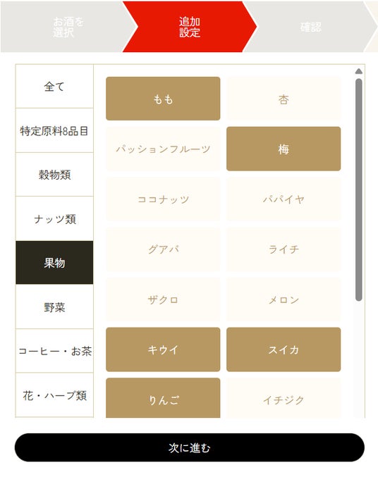 好きなカテゴリを選択できるだけではなく、アレルギーや苦手な原料を除外することも可能です。炭酸のお酒の除外や、ワインベースのお酒除外の他、80種類以上の原料から除外したい原料を細かく設定することで、苦手な味わいのお酒が届く心配がなく安心して購入していただけます。