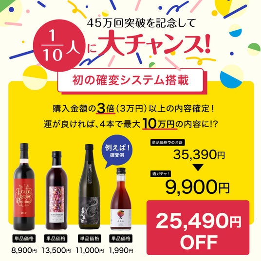 「酒ガチャ」では、当たるお酒の合計金額が必ず購入金額以上と、単品で購入するよりもお得に購入することができる設計になっています。「45万回記念酒ガチャ」では、最大割引率が30%OFFと通常の酒ガチャよりも割引率の高いお酒が届きます。