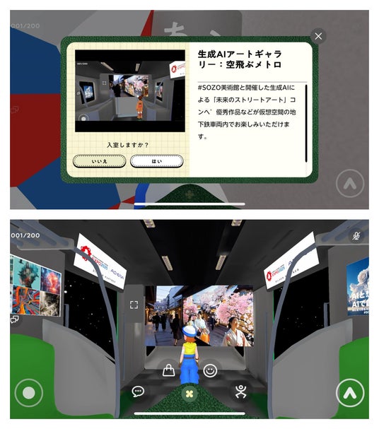 ・「アートギャラリー:空飛ぶメトロ」へのアクセスは、バーチャル会場東ゲート島内にある【V23】のワープポイントから、またはバーチャル万博アプリをダウンロードした後、以下のDeepLinkで仮想空間の車両内にワープしてお楽しみいただけます。