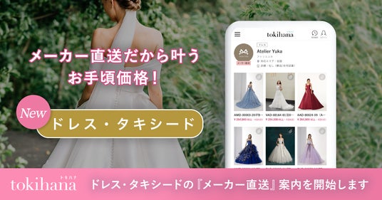 LINEでできる式場探し『トキハナ(https://tokihana.net/)』を運営する株式会社トキハナ(本社:東京都港区、代表取締役社長:安藤 正樹、以下「トキハナ」)は、通常のドレスレンタルの流れである「ドレスメーカー→ショップ→新郎新婦」という構造を見直し、ショップを介さずドレスメーカーと直接契約することで、ウエディングドレス・タキシードなどの衣装をお得にレンタルできる新サービス「メーカー直送」の案内を開始します。