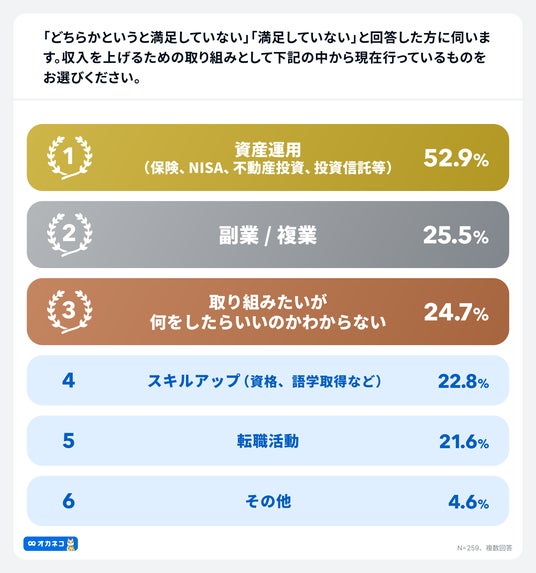 年収:「不満」約7割、昨年よりも9.4ポイント増加。年収アップ策は1位「資産運用」52.9%