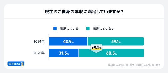 現在の年収に「満足していない」と答えた割合は68.5%となり、前年当社が実施した同様の調査(※2)の結果(59.1%)から9.4ポイント増加しました。昨年に比べて年収への不満が増えていることが分かりました。