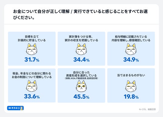 お金について正しく理解/実行できていることを問う質問では、「目標を立て計画的に貯金している」31.7%、「家計簿をつける等、家計の収支を把握している」34.4%、「給与明細に記載されている内容を理解し、都度確認している」34.9%、「税金、年金などの自分に関わるお金の制度について理解している」33.6%、「自分に合った資産形成(保険、NISA、不動産投資、投資信託等)を選択している」45.5%、「当てはまるものがない」19.8%という結果となりました。いずれも、基本的なお金の理解や管理方法を過半数以上の方が「できていない」という状況が明らかになりました。