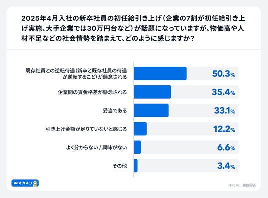 初任給引き上げについて:「既存社員との逆転待遇が懸念」50.3%