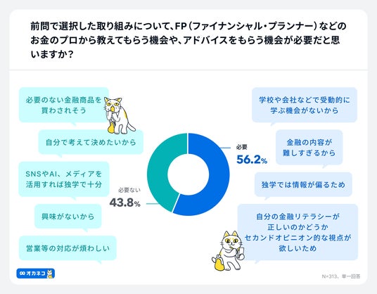 さらに、上記で選択した取り組みについてFP(ファイナンシャル・プランナー)などのお金のプロから教えてもらう機会や、アドバイスをもらう機会が必要だと思うか質問したところ「必要」と回答した方が56.2%という結果になりました。