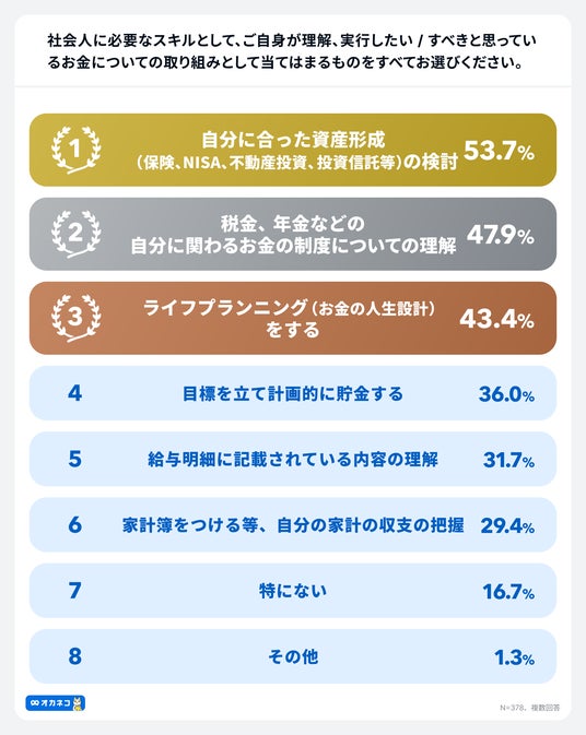 社会人に必要なスキルとして、理解実行したい/すべきと思っている取り組みについて質問したところ、1位が「自分に合った資産形成(保険、NISA、不動産投資、投資信託等)の検討」53.7%、2位「税金、年金などの自分に関わるお金の制度についての理解」47.9%、3位「ライフプランニング(お金の人生設計)をする」43.4%、4位「目標を立て計画的に貯金する」36.0%、5位「給与明細に記載されている内容の理解」31.7%、6位「家計簿をつける等、自分の家計の収支の把握」29.4%という結果になりました。
