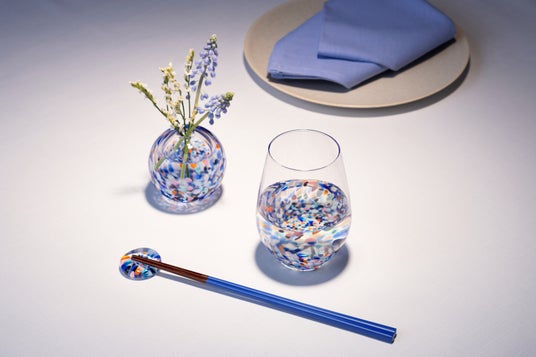 左から、一輪挿し・箸置き・ワインタンブラーと発売中のタンブラー・盃