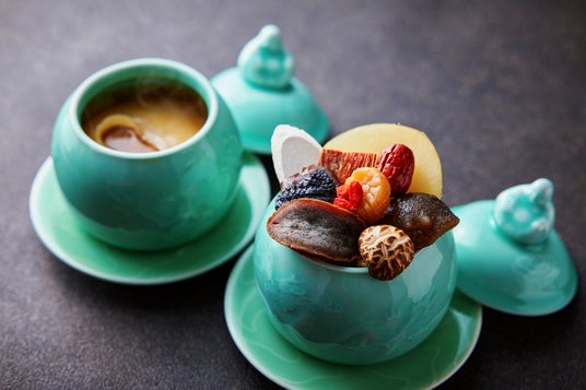 中国料理では山海の食材を乾燥させたものを「乾貨(貨幣に匹敵するほどの価値のある食材)」と呼び、高級食材として珍重します。『山海の珍味 極上蒸しスープ ~ぶっとびスープ~』では、ふかのひれや鮑、貝柱、なまこなどの海の乾貨に加え、烏骨鶏や金華ハム、花椎茸、山芋、ナツメにクコの実といった山の乾貨を使用。数日かけてじっくりと蒸しあげ、香り高い極上のスープに仕上げました。ベースとなるスープは、ほぼ塩のみで味付けされ、乾貨の旨味や出汁を最大限に引き出すようこだわっています。