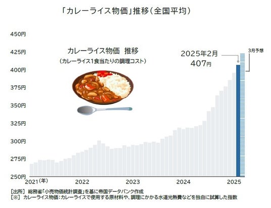 2025年2月のカレーライス物価: 1食あたり407円 / 前年同月+88円、初の400円突破