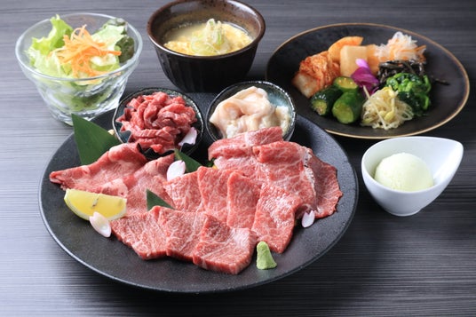 ガーデンサラダ・キムチナムル盛り合わせ・塩タン・焼ユッケ・焼きしゃぶ・特上ロース・本日のあかみ稀少部位・ぷるぷるホルモン・クッパ・柚子シャーベット