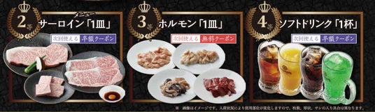 【2等】サーロインメニュー1皿半額クーポン、【3等】ホルモン1皿無料クーポン、【4等】ソフトドリンク1杯半額クーポン