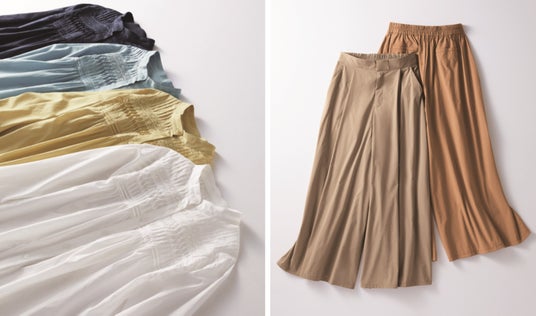 大人女性の体型の悩みを解消するハルメクの新ブランド!ウエストが総ゴムで、引っ張るだけで手間なく履けるパンツ。体に合わせてフィットする素材、立体マチによるすっきりシルエットをぜひ店頭で実感ください。