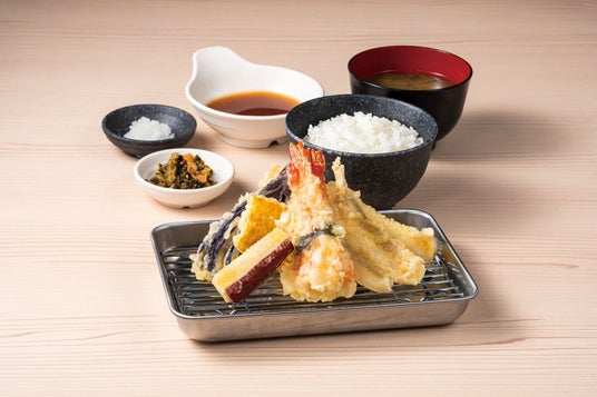 看板メニューである「あおぞら定食」は、海老、生アジ、いか、半熟たまご、茄子、さつまいも、とうもろこしの天ぷらをお楽しみいただけます。『天ぷら定食 あおぞら』では、エクアドル産バナメイ海老を使用しており、海老本来の旨み、食感、食べ応えをお楽しみいただけます。生アジは、一度も冷凍されることなく生のまま店舗に届いており、店内で丁寧に骨を取り除いています。生アジならではのふっくらとした食感と天ぷらならではのサクっとした衣が口の中で融合します。半熟たまごの天ぷらは、ごはんに乗せて特製タレをかけ、“たまごかけごはん”としてもお楽しみいただけます。