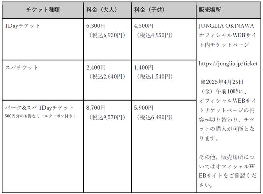 ※上記は国内在住者の料金です。非国内在住者向け一般料金に関する料金および販売場所は、JUNGLIA OKINAWAオフィシャルWEBサイトをご確認ください。