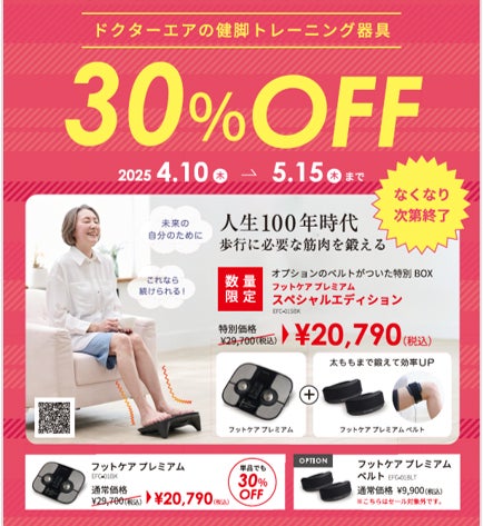 全国約4,000店で取り扱われているトータルボディケアブランド「ドクターエア」で販売する〔EMS・振動・温熱〕の3つの機能で“足トレ&足ケア”を1台で可能にした健康シェア家電【フットケア プレミアム】で春のアクティブライフを応援する“30%OFFキャンペーン”を、2025年4月10日(木)~2025年5月15日(木)の期間限定実施いたします。