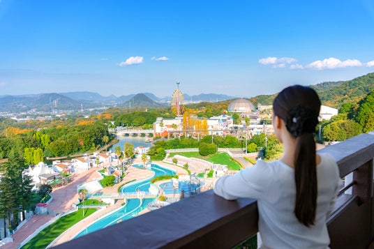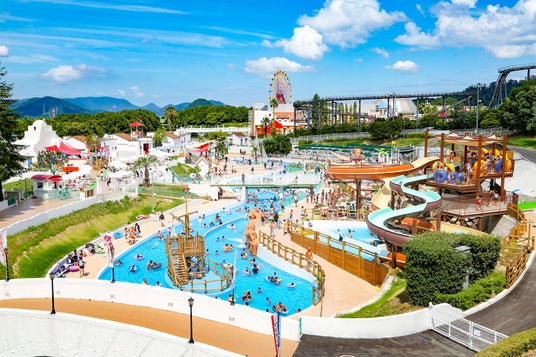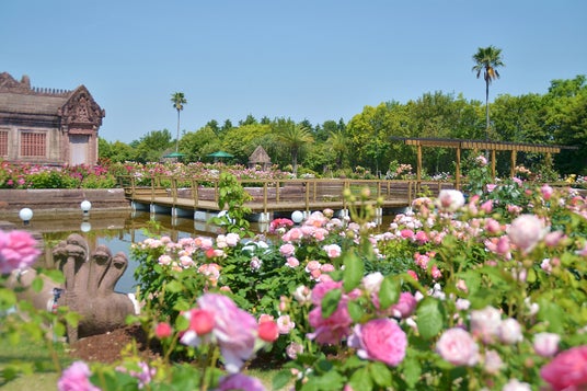 ジェットコースターや大観覧車など、約20種類以上のアトラクションやキャラクターのパレードなどが楽しめるエリアのほか、チューリップやバラなど四季折々の花を愛でられる「レオマ花ワールド」、アジアの有名な遺跡を忠実に再現した「オリエンタルトリップ」などさまざまなテーマが設けられていて、1日では回りきれないスケールのテーマパークです。