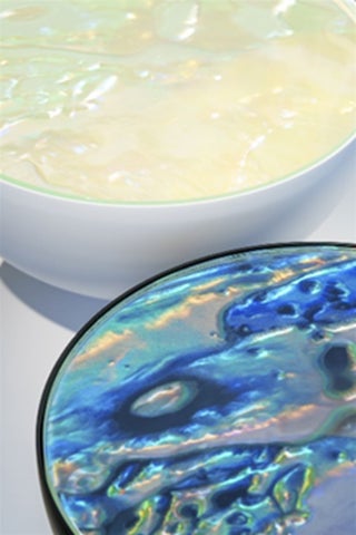 自然が生み出す美しい「構造色」は、古代から装飾品にも用いられてきました。「構造色インクジェット技術」は、富士フイルムグループの分子制御技術を応用し、フィルム基材上に吐出したインク内に微細な構造を形成して発色させるものです。色味の異なる構造色を発現するインクを複数種用意し、その組み合わせやインクの濃度を調整しながら、構造色のパターンやグラデーションなどを自在に描画することで、高い意匠性を実現します。