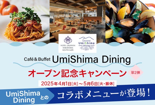 ホテルグランヴィア広島(広島市南区、代表取締役社長:島田正義)の2階「カフェ&ブッフェ ディッシュパレード」(以下「ディッシュパレード」)では、3月24日(月)にオープンしたホテルグランヴィア広島サウスゲート(以下「サウスゲート」)のレストラン「Cafe&Buffet UmiShima Dining」(以下「UmiShima Dining」)の開業を記念したキャンペーン第2弾として、4月1日(火)から5月6日(火・振休)の期間限定で「UmiShima Dining」とのコラボメニューが登場!さらに、ゴールデンウィーク期間には、親子でイベントを楽しむスペシャルブッフェもご用意。この機会に、イタリア&スペインの美食と、「UmiShima Dining」とのコラボメニューをぜひお楽しみください。