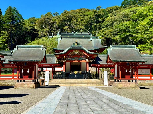 現在の社殿は江戸時代の正徳5年(1715年)に薩摩藩主・島津吉貴によって建立されました。火山の溶岩の傾斜の上に建てられ、地形の高低差を利用して正面から美しい姿が見られます。