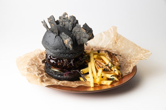 瓦礫と咆哮(GODZILLA BURGER) 2,200円壊れた街をイメージしたインパクトのある一皿。ハンバーガーバンズでGODZILLAのゴツゴツとした体表と高層ビル群を破壊するその姿を表現しました。黒いソースがゴジラの怒りと破壊力を象徴し、瓦礫と化した街をフレンチフライで、茶色の筋入りパラフィン紙で包み込むことで、現場の荒涼とした模様を再現しました。