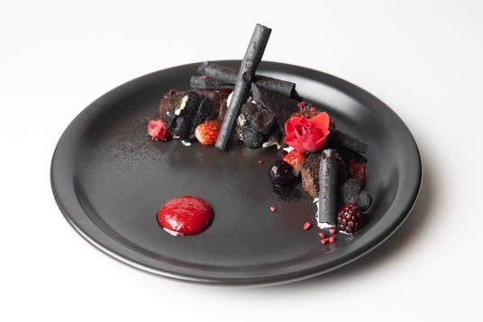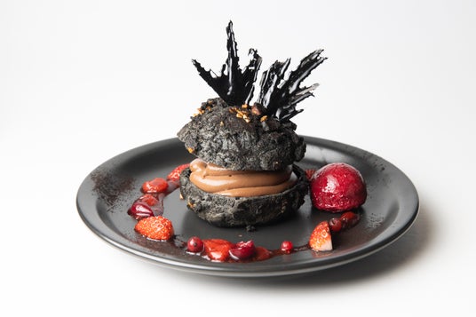 破壊と再生のメタファー(フランス伝統菓子・ヴァシュラン) 1,980円フランス発祥の伝統菓子のアレンジで、サクサクの竹炭メレンゲとアイスクリーム、ミックスベリー、生クリーム、フランボワーズソースなどを盛り付け、破壊と再生をテーマにしながら、黒と赤のコントラストが華やかなデザートに仕立てました。