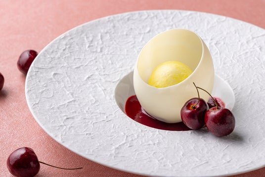 Cherry Carpaccio & Elderflower Jellyチェリーカルパッチョ・エルダーフラワーゼリーバニラとスターアニスで香り豊かにマリネしたスパイシーチェリーに、エルダーフラワーの華やかな香りが絶妙に調和した一品です。