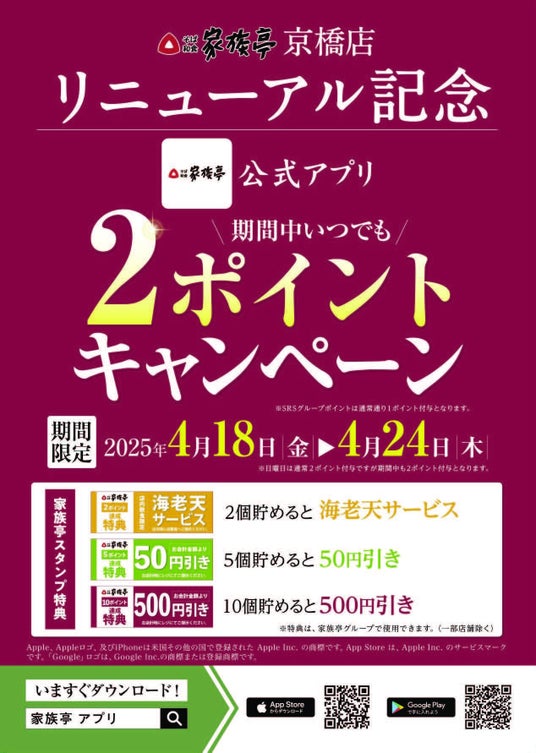 【家族亭アプリスタンプ2ポイントキャンペーン概要】