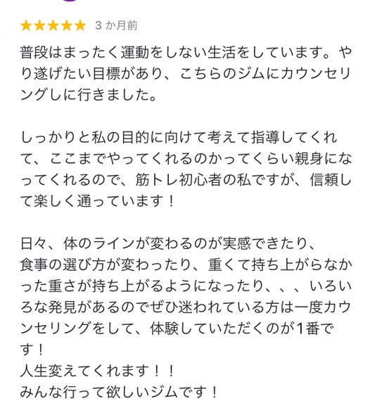 しっかりと私の目的に向けて考えて指導してくれて、ここまでやってくれるのかってくらい親身になってくれるので、筋トレ初心者の私ですが、信頼して楽しく通っています!