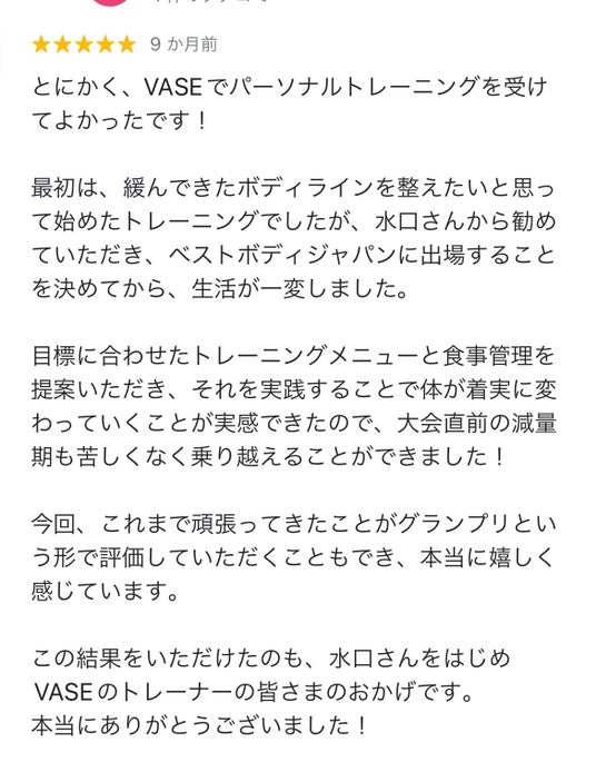 この結果をいただけたのも、水口さんをはじめVASEのトレーナーの皆さまのおかげです。