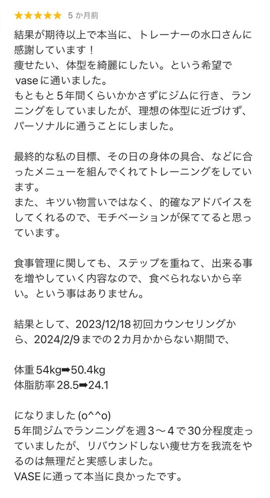 結果が期待以上で本当に、トレーナーの水口さんに感謝しています!