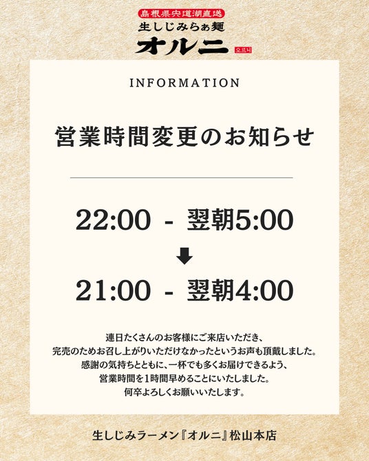 オルニ株式会社(本社:東京都渋谷区、代表取締役:熊崎雅崇)は、2025年4月より、生しじみラーメン『オルニ』松山本店の営業時間を変更し、21:00~翌朝4:00での営業を開始いたしました。