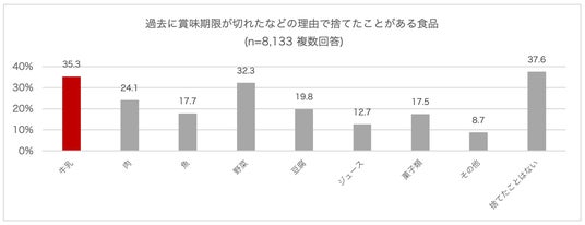 過去に賞味期限が切れたなどの理由で捨てたことがある食品の最多は「牛乳」で35.3%、続いて野菜が32.3%、肉が24.1%という結果になりました。また、6割以上の人が過去にフードロスの経験があることがわかりました。