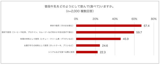 牛乳の使用方法については「そのまま飲む」が67.4%で最も多く、コーヒーや紅茶などの割材としての使用が59.7%であり、割材としての使用も多いことがわかりました。料理の材料としての使用も45.9%と半数近くありました。