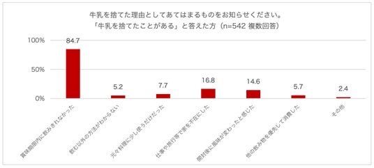 牛乳を捨てたことがある理由は「賞味期限切れ」が圧倒的1位で84.7%、続いて仕事や旅行等で家を不在にした、開封後に風味が変わったと感じた、などが挙げられました。