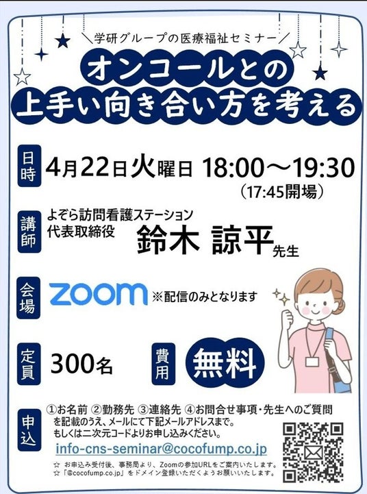 株式会社 学研ホールディングス(東京・品川/代表取締役社長:宮原博昭)のグループ会社で、訪問看護事業を行っている株式会社 学研ココファン・ナーシング(東京・品川/代表取締役社長 :木村 祐介/以下、当社)は、2025年4月22日(火)、無料の医療福祉セミナー「オンコールとの上手い向き合い方を考える」を開催いたします。