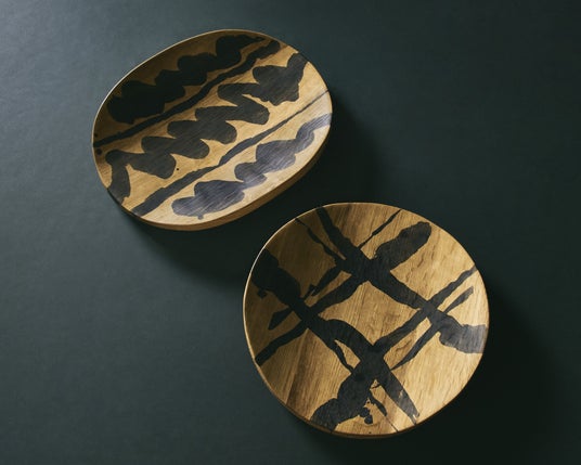 鹿児島県出身でウッドターニングによる作品を主に製作している盛永省治氏は、一度解体されたオーク材のウィスキー樽の湾曲している部分を再度剥ぎ合わせたトレイを製作。スリップウェア風の落書きは鉄媒染液というものでペイントし、個性溢れたトレイが完成。また会場では、盛永氏製作による樽材を使ったウォールアートも販売。トレイ各¥88000