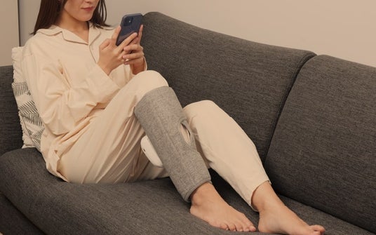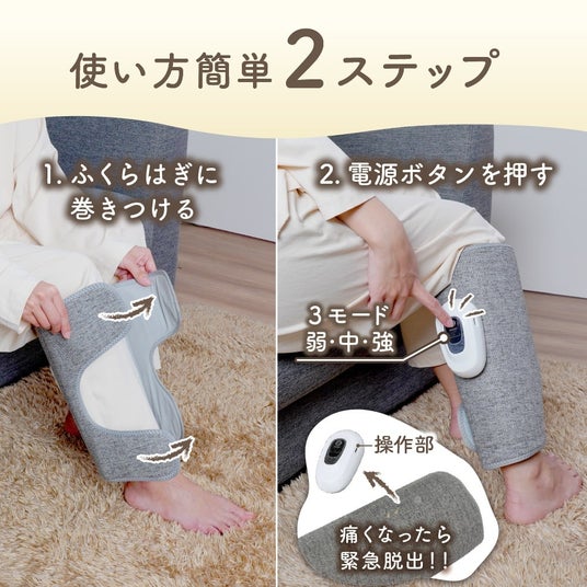 使い方は簡単、ふくらはぎに巻きつけて電源を入れるだけ。