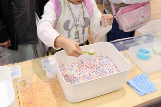 期間中、平日の4月28日(月)、30日(水)、5月1日(木)、2日(金)はオフピークと予想されます。なるべく混雑を避けて、親子でスライムづくりを体験されたい方におすすめです。また、混雑解消のために、時間ごとに入場の定員を設けます。