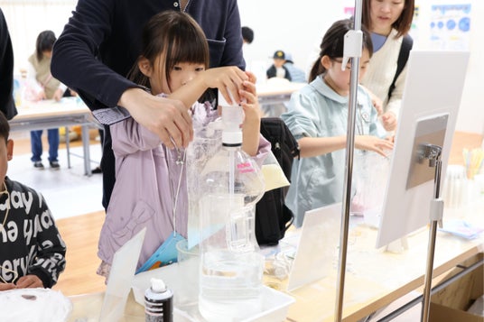 暗闇で光るスライムや、ふわふわスライム、紫外線で色が変わるスライムなど、試薬を混ぜていろいろなスライムがつくれます。さらに、スライムのレシピ研究や薬品を混ぜる合成研究など、遊び気分で科学を体験できます。