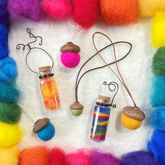 こびんに羊毛を詰め込んで針金でホルダーに、羊毛ボールとどんぐり帽子を合わせてストラップ、など羊を感じる羊毛ワークショップを開催します。