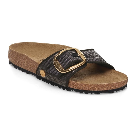 今回発売されるMADRID とARIZONAでは、この天然コルクのフットベッドがラフィアの素材感と絶妙にマッチし、夏の素足に軽やかな抜け感を添えます。きらりと輝く大ぶりのバックルは夏の人気仕様で、ナチュラルとブラック、それぞれのカラーを引き立てます。