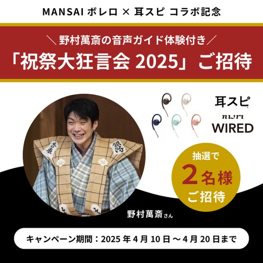 NTTソノリティ株式会社(本社:東京都新宿区、代表取締役社長:坂井 博、以下「NTTソノリティ」)は、2025年4月26日(土)に大阪フェスティバルホールで開催される「祝祭大狂言会2025」の演目『MANSAIボレロ』において、NTT独自の音響XR技術とPSZ(パーソナライズドサウンドゾーン)技術を搭載した「nwm(ヌーム)」のオープンイヤー型有線耳スピーカー「nwm WIRED」を活用した音響演出、野村萬斎氏による「スペシャル音声ガイド」の実施が決定したことをお知らせいたします。これを記念して、nwm公式Xアカウントでは「祝祭大狂言会2025」スペシャル音声ガイド付き鑑賞席が当たるキャンペーンを実施します。