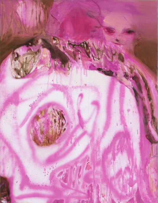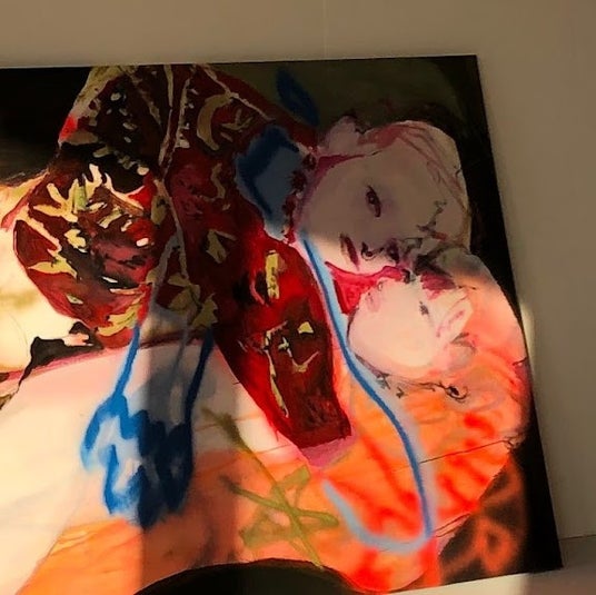 "密接した 2 人"には愛情や安堵を示すものと、片や死、恐怖、憎しみの感情、一方的に振るわれる暴力的なもの、を引用している。それは、密接する 2 人のイメージが愛情からなるものと暴力からなるもの、真逆と思っていたことが絵画上ではとても似ている、見分けがつかない、そのことに気付いた経験に由来している。(抱き合えるのは別々の体だからだ、では暴力は?)その矛盾について、絵画にはなにが示されていて、隠されていて、なにをあるものとして、ないものとしているのか。絵画の中で逡巡している。