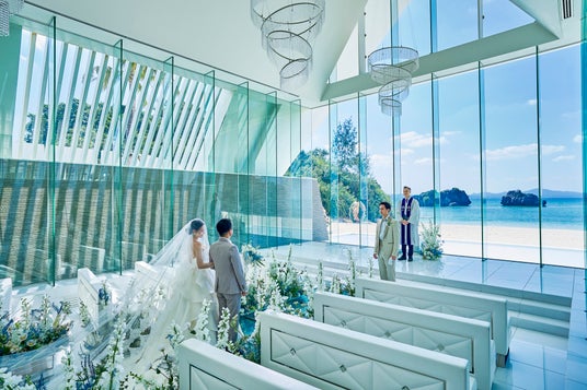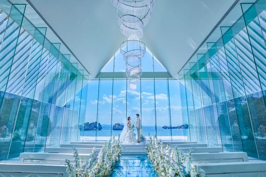 祭壇の奥に広がる青い海、白く輝く空間に煌めくガラスのバージンロード。
