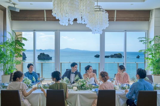 海を一望するオーシャンフロントバンケットは、落ち着いた雰囲気でパーティーができると高評価をいただきました。バンケットから臨む名護湾の眺望もゲストへのおもてなしになると、大変ご好評いただいております。